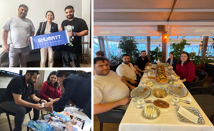 拜访完第一位客户后,舒玛特代表们便立即出发拜访下一位客户。到达第二个目的地时,Ruby和Rebecca通过舒马特的宣传册与客户重点交流了共轨喷油器,与举着横幅的客户合影,并和客户共进精致晚餐,在伊斯坦布尔度过了一个难忘的夜晚。